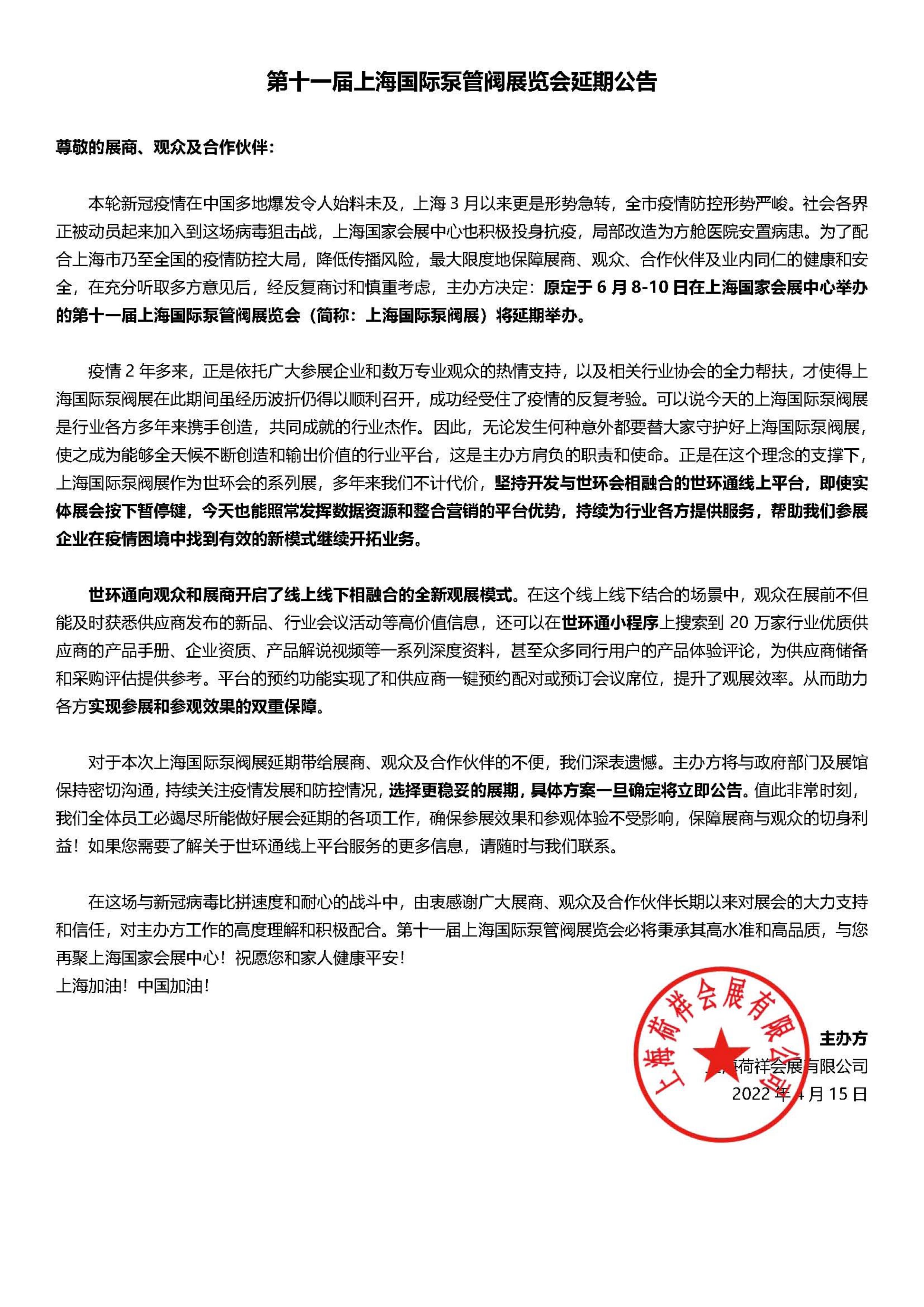 本輪新冠疫情在中國(guó)多地爆發(fā)令人始料未及,上海3月以來(lái)更是形勢(shì)急轉(zhuǎn),全市疫情防控形勢(shì)嚴(yán)峻。社會(huì)各界正被動(dòng)員起來(lái)加入到這場(chǎng)病毒狙擊戰(zhàn),上海國(guó)家會(huì)展中心也積極投身抗疫,局部改造為方艙醫(yī)院安置病患。為了配合上海市乃至全國(guó)的疫情防控大局,降低傳播風(fēng)險(xiǎn),最大限度地保障展商、觀眾、合作伙伴及業(yè)內(nèi)同仁的健康和安全,在充分聽取多方意見后,經(jīng)反復(fù)商討和慎重考慮,主辦方?jīng)Q定:原定于6月8-10日在上海國(guó)家會(huì)展中心舉辦的第十一屆上海國(guó)際泵管閥展覽會(huì)(簡(jiǎn)稱:上海國(guó)際泵閥展)將延期舉辦。